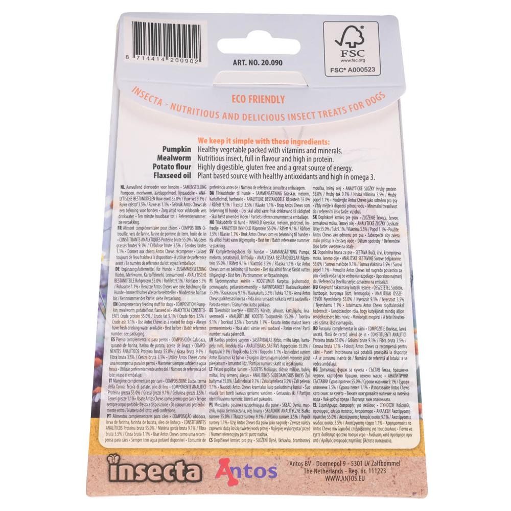 Insecta Nibbles zijn voedzame en smakelijke hondensnoepjes. Pompoen is een gezonde groente, vol met vitamines en mineralen. Meelworm is een insect, vol met smaak en proteïnen. Ook al halen wij er onze neus voor op, insecten worden in andere delen van de wereld als een delicatesse beschouwd. Honden vinden insecten vaak ook heel erg lekker! Insectensoorten zoals meelwormen en krekels bevatten veel ijzer, eiwitten, omega 3-vetzuren, vitamine A, B1 en B12, wat betekent dat ze prima als een gezond alternatief voor vlees kunnen dienen.