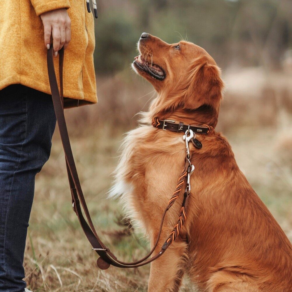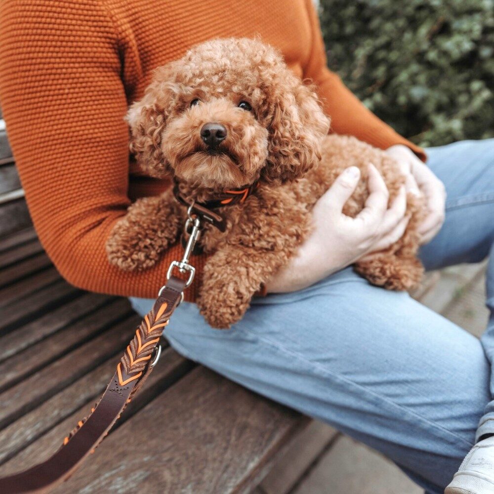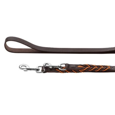 Deze mooie, handgemaakte hondenriem heeft een opvallend handgevlochten, decoratief touw in oranje kleur. De afgeronde randen van deze hondenriem zorgen voor een comfortabel gevoel in de hand, zelfs als jouw hond plotseling begint te springen en aan de riem trekt. Er is tevens een mooie bijpassende halsband verkrijgbaar. Deze hondenriem is ook gemakkelijk te combineren met een bruine halsband of bruin tuigje.