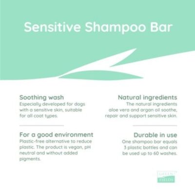 Deze shampoo bar is speciaal ontwikkeld voor honden met een gevoelige huid. Deze natuurlijke en plasticvrije shampoo zit boordevol natuurlijke ingrediënten, zoals aloë vera en argan olie. Aloë vera zit vol met vitaminen die helpen om de huid te kalmeren. Argan olie bevat veel vitaminen, mineralen en vetzuren, die het herstel van een beschadigde, geïrriteerde of gevoelige huid ondersteunen.
